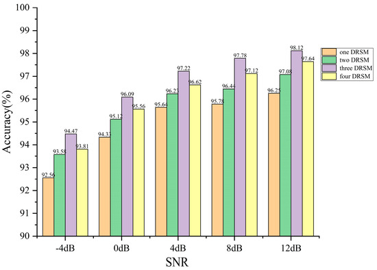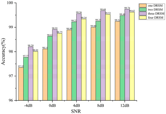 In order to test the noise immunity of a different number of RSBUs, the number of RSBUs is adjusted without changing the preprocessing and other layer hyperparameters. Five different SNRs are added to the original vibration signal to compare the effect of the number of RSBUs on diagnostic performance. Figure 5 shows the average of the network after 150 iterations of training and five tests.