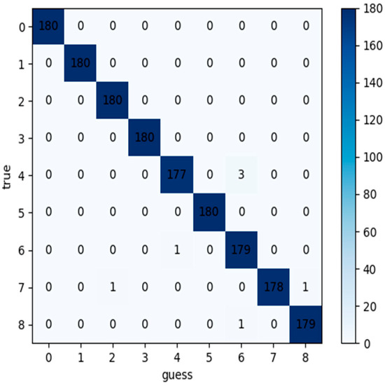When the number of RSBUs is one or two, the network depth is insufficient, which limits the expression and learning ability of the model, resulting in the performance of the model not reaching the optimum. When the number of RSBUs is four, the number of model parameters is too large, resulting in network degradation and decreased diagnostic capabilities. When the number of RSBUs is three, the model has the highest diagnostic accuracy, and the accuracy of the test set reaches 99.56% when the signal-to-noise ratio is 4 dB. In order to better simulate the noise in actual operation, taking the signal-to-noise ratio equal to 4 dB as an example, the accuracy curve of the model is shown in Figure 6. The convergence curves of training and testing have achieved a good fitting effect, and the visual classification of the test set in the confusion matrix and T-SNE is shown in Figure 7 and Figure 8. It can be clearly found that the same type of fault has a good aggregation and different types of features can be effectively distinguished. The proposed method can be used to reshape and classify them in the high-dimensional space.
