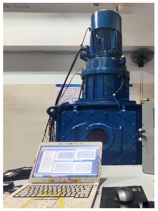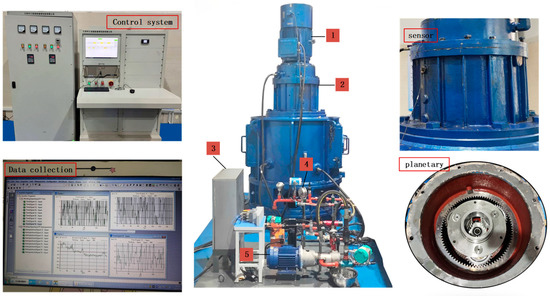 Combined with the actual structure size of the nuclear power planetary gearbox, a proportionally reduced nuclear power planetary gearbox test bench is designed, as shown in Figure 9. The test bench is mainly composed of the control system, transmission device, power system, loading system, and lubrication system. The transmission device transmits power from the vertical motor to the horizontal load motor and realizes the effective connection between them. The lubrication system lubricates the transmission and filters, as well as cools the oil. The control system is responsible for changing the input speed and load of the equipment. During the test, the BK sensor and its supporting Pulse system were used for data acquisition, and the acquisition card used BK’s Type3053-B-120 made in Denmark. Combined with the test requirements, the transmission route of the planetary gear train is analyzed [29], and in order to ensure the quality of vibration signal acquisition, the sensor is installed on the box wall closest to the planetary gear.