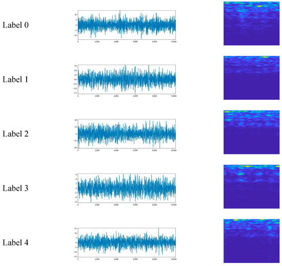 Figure 12 shows the original vibration signal of a planetary gear system randomly selected for five states and their image (112 × 112 pixels) after STFT. Table 6 shows the composition of the planetary gear train crack fault dataset obtained in this paper. A sliding window containing 1024 data points is used to sample the vibration signals of the planetary gear train in five states, with a window step size of 300, and each state contains 900 samples. Similarly, the training, validation, and test sets are randomly divided in the ratio of 3:1:1, and the final dataset contains 2700 training set samples, 900 validation sets, and 900 test set samples each. The structure of the training set, validation set, and test set of the upper and lower channels, as well as the data preprocessing steps and hyperparameter settings, are consistent with the preceding ones, and will not be repeated here.