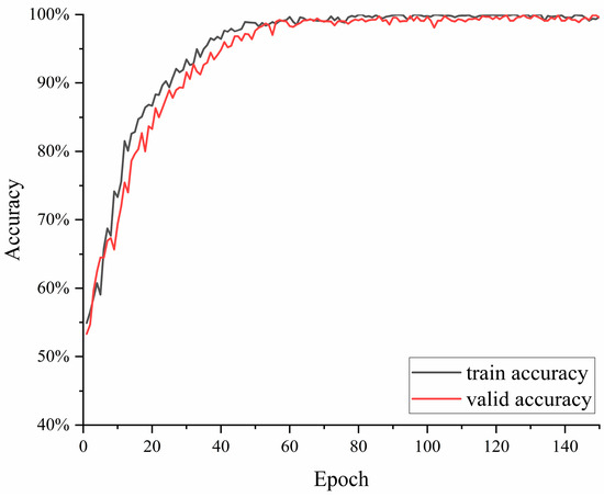 In order to simulate various noise interferences in the actual operation of the nuclear power gearbox and test the diagnostic accuracy of the model under different levels of noise, five kinds of noise with different SNR are set, and the accuracy of the test set under different SNRs and different RSBUs is shown in Figure 13. When RSBUs is equal to three, the fault diagnosis accuracy is the highest, which is consistent with the previous results. Therefore, RSBUs equal to three is determined as the fixed parameter of DC-DRSN. It is not difficult to see that with the increase in the SNR, the accuracy of diagnosis also increases, and the diagnostic accuracy of the test set is still as high as 97.22% when the SNR is 4 dB. In view of the fact that the SNR in gearbox fault diagnosis studies is often between 0 and 10 dB to simulate the noise level in the actual industrial environment [30], and 4 dB is in the middle of this range, which is a reasonable and representative value, and is helpful to test the robustness and reliability of the fault diagnosis method, therefore, under the SNR 4 dB, DC-DRSN is used to train and classify the nuclear power planetary gearbox dataset, and the accuracy changes in the obtained training set and the validation set are shown in Figure 14. It can be seen that when the number of iterations is less than 50, the accuracy of the training set and the validation set increases but there is oscillation, and the diagnostic performance of the model is improving but the stability needs to be improved. When the number of iterations is more than 50, the training set gradually stabilizes, and the accuracy is close to 100%, and the oscillation of the validation set is greatly reduced compared with before, and the accuracy reaches 99%. After about 150 iterations, the model has good diagnostic performance and stable accuracy.