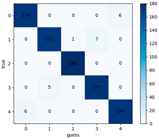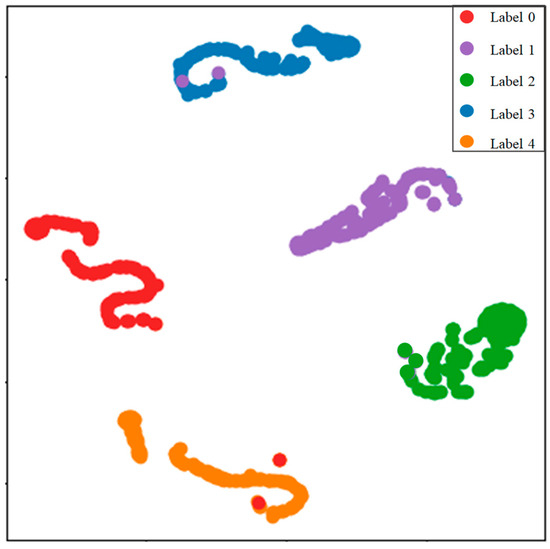 The confusion matrix and the T-SNE visualization representation of the classification results are shown in Figure 15 and Figure 16, respectively. It is not difficult to find that label 2 has the best sample classification effect, with an accuracy rate of 100%. Label 0 and label 4 have six samples misclassified with each other, five samples from label 3 are classified into label 1, and eight samples from label 1 are misclassified. The results show that the change of gear crack type and load has a great influence on the classification accuracy, and most of the samples are correctly classified. Although there are a few sample errors, the minimum accuracy is still 95.56%, which verifies the effectiveness of DC-DRSN classification for different working conditions. The T-SNE visualization also shows that the distribution interval of each type of fault is regular and orderly, and the spacing of similar faults is very small, which further verifies the superiority of the proposed method.