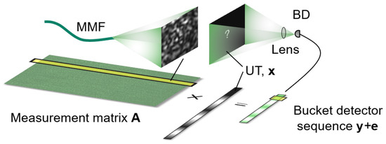 Multimode fibers (MMFs) are expected extensions of fiber bundles [1,2,3,4,5,6], and examples include endoscopic probes [7,8]. However, mode coupling and dispersion scramble transmitted images into unrecognizable speckles, rendering direct imaging impossible. Therefore, several methods have been developed for MMF imaging, such as (1) wavefront shaping-based raster scanning [9,10,11,12]; (2) single-pixel imaging (SPI [13] or, equivalently, ghost imaging [14]); and (3) machine learning [15,16,17,18]. Wavefront shaping requires complex interference setups to measure transmission matrices for characterization of MMF transmission and to control the output of scanned point-by-point MMF objects. Machine learning methods leverage large datasets to train models that can reconstruct images from speckle patterns and require extensive training data. In MMF-SPI [19,20,21,22,23,24,25,26,27,28], MMF is used as a light projector to illuminate the target; then, the light intensity response of the target is recorded. With the help of SPI algorithms, the image can be recovered [29]. Compared with raster scanning and machine learning methods, SPI has advantages in terms of simplicity compared to wavefront shaping because only light intensity is required, avoiding interference setups; it also has advantages in terms of imaging speeds compared to machine learning because a few measurements are enough.