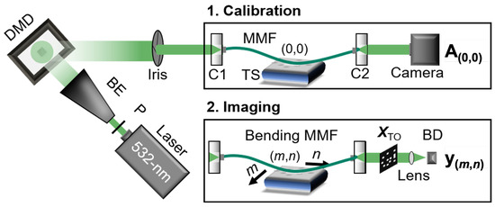 First, the measurement matrix should be obtained via realistic calibration, as shown in Figure 2. Polarized and expanded 532 nm coherent light was modulated by a digital micro-mirror device (DMD). Then, it was shaped by an iris and coupled into fibers via collimator C1. After transmission, an output speckle pattern was collimated via C2. Then, 2500 pseudo-random illumination patterns were consecutively captured by a CMOS camera and, finally, shaped into , where the sub-label represents the initial translation stage (TS) position. Note that the VAR and TOL parameters of ATTD were calibrated via simulations using . Here, TOL was set at 0.4 (refer to Appendix A).