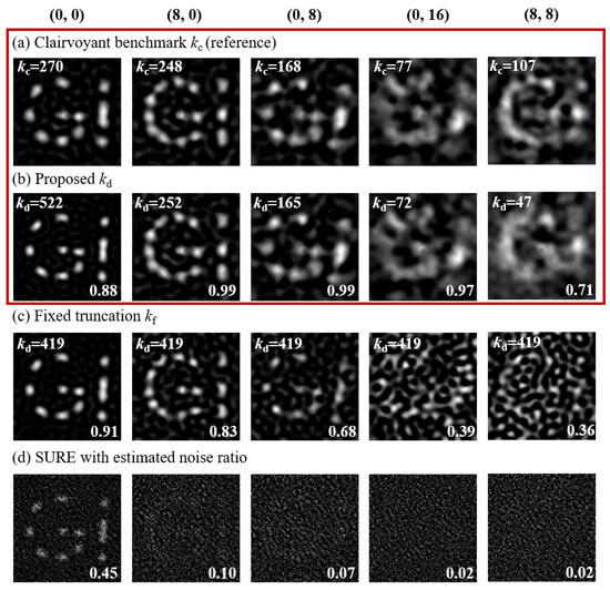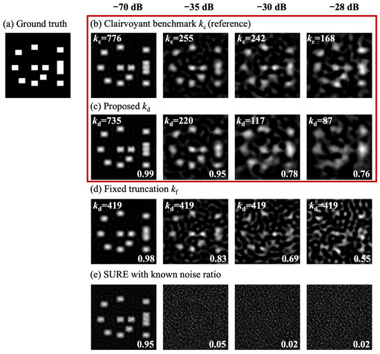 (a) Ground truth of and adaptive performance comparison using simulated noises (ratio = −70 dB, −35 dB, −30 dB, and −28 dB) using (b) clairvoyant benchmark , (c) ATTD , (d) fixed , and (e) SURE with a known noise ratio. The truncation threshold and Pearson correlation with clairvoyant images are marked in each image. Above each column, the noise ratio is denoted.