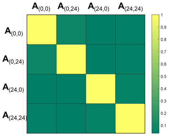 Pearson correlation coefficients among measuring matrices () captured at the following different positions (m, n): (0, 0), (0, 24), (24, 0), and (24, 24).