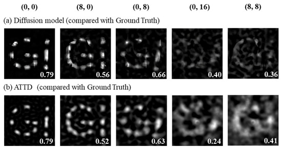 Figure 6 compares the diffusion model and ATTD under the following noise conditions: (0, 0), (8, 0), (0, 8), (0, 16), and (8, 8). The numbers in the images indicate the Pearson correlation coefficients between the reconstructions and the ground truth. At the (0, 0) noise level, both methods exhibited a high correlation of 0.79. As noise levels increased, the diffusion model maintained a slight edge, with correlations of 0.56 and 0.66 at (8, 0) and (0, 8) compared to ATTD’s 0.52 and 0.63, respectively. At (0, 16), the diffusion model performed better (0.40 vs. 0.24). However, at the highest noise level (8, 8), ATTD showed improved resilience, with a correlation of 0.41, surpassing the diffusion model’s 0.36. These results indicate that while the diffusion model performed slightly better at moderate noise levels, ATTD was more robust under high and mixed noise conditions. Additionally, generating a single recovery result with the diffusion model takes approximately 86 s, highlighting ATTD’s significant time advantage. We believe that if more disturbed data can be used for training, better performance may be realized under high noise levels.