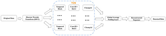 The processing pipeline of the model involves three key steps. First, the input time series data undergo processing in the wavelet transform layer, where it is decomposed into approximation coefficients and detail coefficients of different scales to obtain feature representations. Subsequently, these feature representations are passed to the temporal convolutional network for further processing. The temporal convolutional network consists of stacked convolutional layers and activation functions, aimed at extracting long-term and short-term dependencies in the time series data. Finally, the output of TCN is processed through a global average pooling layer to aggregate features, generating the final denoised time series data. The entire process aims to denoise time series data efficiently by combining the processing capabilities of wavelet transform and temporal convolutional networks. The specific process is illustrated in Figure 2.