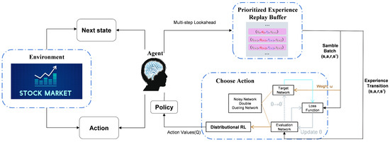 Rainbow DQN (Rainbow Deep Q Network) stands as an innovative advancement in deep reinforcement learning, aiming to overcome the limitations of standard Deep Q Network (DQN) algorithms [18]. It integrates various enhancements such as prioritized experience replay, double Q-learning, dueling architecture, multi-step learning, distributional RL, and noisy networks, offering improved sample efficiency, faster learning, and enhanced generalization capabilities. Rainbow DQN is particularly notable for its application in predicting buy/sell signals for stock prices using integrated deep learning techniques. This comprehensive approach makes Rainbow DQN a potent tool for addressing a wide range of reinforcement learning challenges. The specific working diagram of Rainbow DQN is shown in Figure 3.