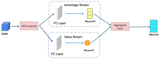Dueling networks introduced a novel approach utilizing two separate streams in the neural network architecture [21]. One stream, known as the value stream , is dedicated to directly estimating the value function for states. This is particularly effective because states often exhibit minimal variation. The other stream, termed the advantage stream , focuses on estimating the advantage for each action, thereby capturing the differences in action outcomes within each state. By aggregating the outputs from both streams, the model can derive action values effectively. This innovative framework enhances the network’s ability to understand and represent the nuanced relationships between states and actions. The architecture and formulae are represented as shown in Figure 4 and Equation (5).