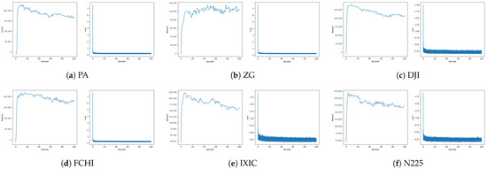 The accumulation of rewards and the variation trend of the loss function during the training process of the CMR-DQN model on six datasets.