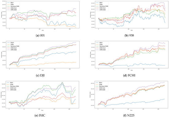 Figure 6 displays the cumulative asset growth curves for various strategies, including B&H, DQN, Rainbow DQN, DQN-GLA, and the newly proposed CMR-DQN. It is evident from the graph that the performance of the CMR-DQN strategy surpasses that of the others. CMR-DQN not only significantly reduces loss risk but also achieves higher returns. Moreover, under the CMR-DQN strategy, total asset growth is smoother compared to the benchmark strategy.