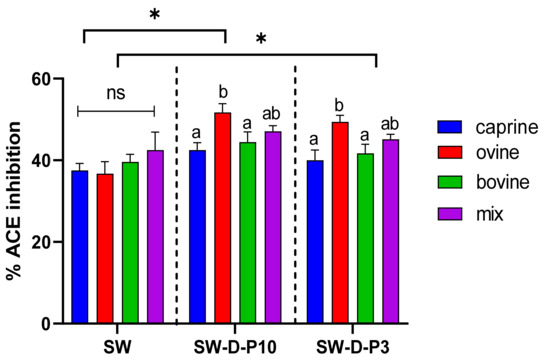 Effect of animal origin of sweet whey (SW) on angiotensin-converting enzyme (ACE)-inhibitory activity (%) before and after in vitro digestion. The vertical dashed lines separate the three different groups as follows: SW: sweet whey before digestion; SW-D-P10: digested fraction below 10 kDa after digestion; SW-D-P3: digested fraction below 3 kDa. Data are presented as means ± SEM of three independent experiments. Columns with different letters significantly differ within the same group (p < 0.05). * indicates a significant difference between two groups (p < 0.05); ns indicates no significant difference between two groups (p > 0.05).