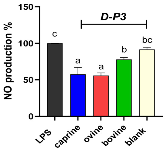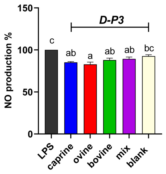 Effect of SW-D-P3 on LPS-induced NO production in RAW 264.7 cells. RAW 264.7 cells were treated as follows: LPS, cells stimulated only with 1 μg/mL LPS; D-P3, cells stimulated with LPS and subsequently incubated in the presence of SW-D-P3 (caprine, ovine, bovine, and mix; 0.038% w/v refers to starting SW-D protein) or BL-D-P3 (blank) for 24 h. Data are presented as means ± SEM of four independent experiments. Columns with different letters are significantly different (p < 0.05).