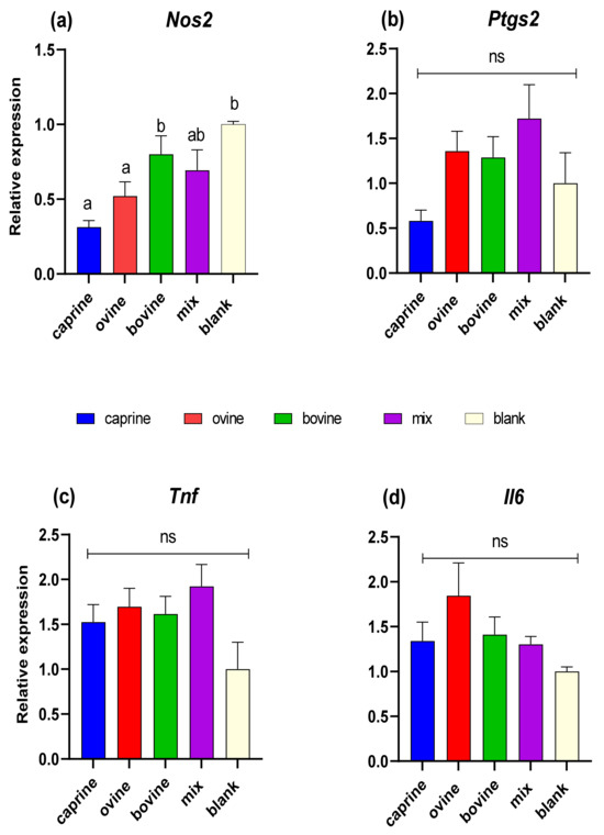 In this study, the relative expression of Nos2, Ptgs2, Il6, and Tnf inflammation-related genes was quantified in response to treatment with D-P3 in LPS-stimulated RAW 264.7 macrophages. As shown in Figure 5a, Nos2 expression was found to be higher (p < 0.05) in BL-D-P3 when compared with caprine and ovine SW-D-P3 but not with bovine and mixed ones. Also, higher Nos2 mRNA levels were observed for bovine SW-D-P3 compared to caprine and ovine SW-D-P3. On the other hand, no statistically significant differences were observed between SW treatments and BL-D-P3 regarding Ptgs2, Tnf, and Il6 expression (p > 0.05; Figure 5b, c, and d, respectively).