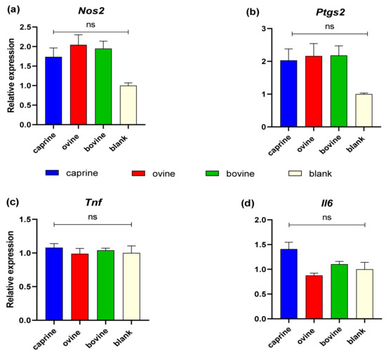 Effect of YAW-D-P3 on LPS-induced mRNA expression in RAW 264.7 cells. RAW 264.7 cells were treated as follows: LPS, cells stimulated only with 1 μg/mL LPS; D-P3, cells stimulated with LPS and subsequently incubated in the presence of YAW-D-P3 (caprine, ovine, and bovine; 0.011% w/v refers to starting YAW-D protein) or BL-D-P3 (blank) for 24 h. The expression levels of (a) Nos2, (b) Ptgs2, (c) Tnf, and (d) Il6 were measured using qPCR and were normalized to housekeeping genes (Actb and Cyc1). Data are presented as mean ± SEM of two independent experiments. ns = not significant (p > 0.05).