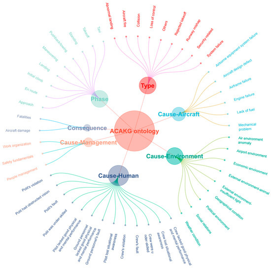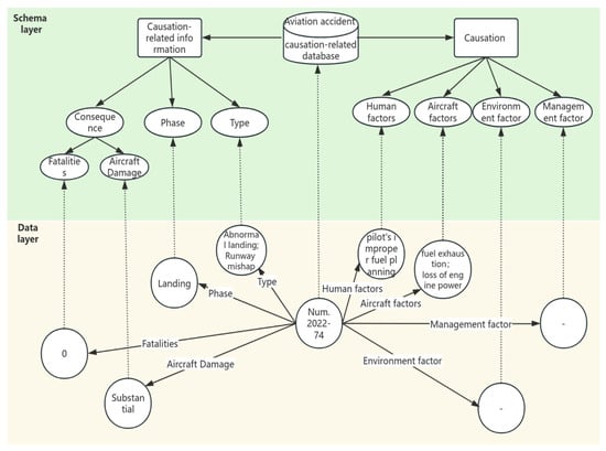 Based on the aviation accident database that is described above, a total of 437 aviation accident reports from the five-year period of 2018–2022 were used for entity identification to construct the ACAKG ontology framework from four entity dimensions, including accident causation, flight phase, accident type, and accident consequence. Based on the information extracted from the database, the ACAKG constructed the schema layer and data layer, as shown in Figure 4.