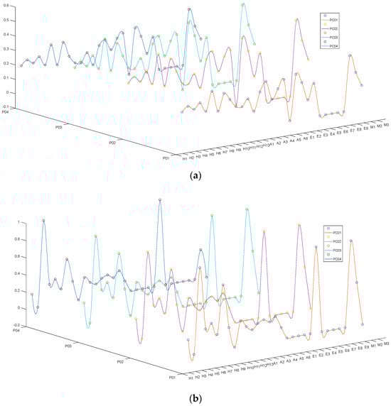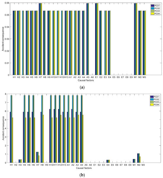 Figure 5 shows the Active Risk Level and Passive Risk Level for all causal factors. For different flight phases, the Passive Risk Level of an accident causal factor is generally higher than its Active Risk Level. Horizontally, it can be concluded from Figure 5a that among the H-type, the Active Risk Levels of H06 and H08 are significantly higher than those of the others; among the A-type, the Active Risk Levels of A02 and A05 are significantly higher than those of the others; among the E-type, the Active Risk Levels of E01 and E04 are significantly higher than those of the others; and among the M-type, the Active Risk Level of M01 is significantly higher than that of M02. From Figure 5b, it can be concluded that among the H-type, the Passive Risk Levels of H03 and H07 are significantly higher than those of the others; among the E-type, the Passive Risk Level of E04 is significantly higher than that of the others; and among the M-type causal factors, the Passive Risk Level of M01 is significantly higher than that of M02. This indicates that these causal factors are more likely to be caused by others and require special attention.