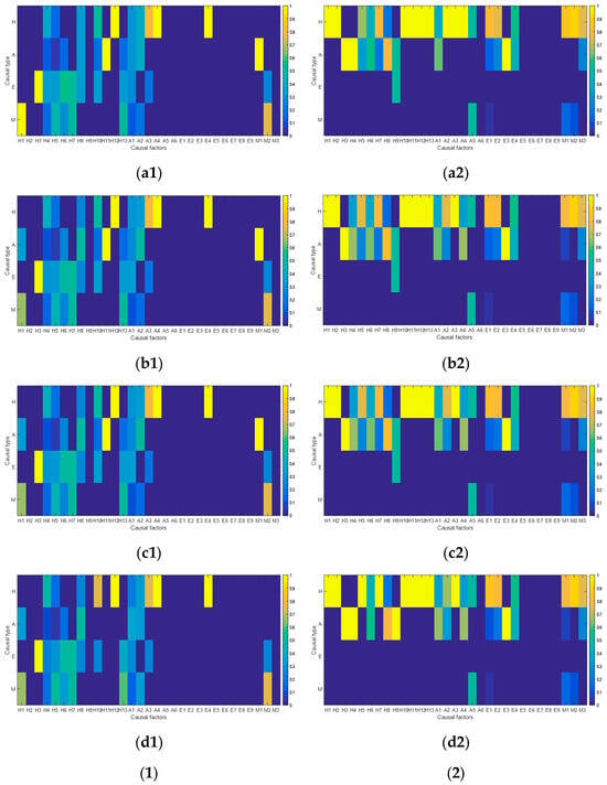 Figure 7 shows the direct and indirect correlations for different types of accident causation. Figure 7a shows the direct and indirect correlations of accident causal types during the ground phase. Overall, the H-type and M-type causations have the highest direct accessibility, followed by higher direct accessibility between the H-type and E-type and the A-type and H-type causations, indicating a higher direct correlation between these types of accident causal factors, and there is higher indirect accessibility between the H-type and H-type, A-type and H-type, and H-type and A-type causations, indicating a higher indirect correlation between these types of accident causal factors. In addition, there is no direct or indirect accessibility of accident causal factors between the E-type and A-type, E-type and E-type, E-type and M-type, and M-type and H-type causations. The direct and indirect correlations of accident causation types in the take-off/landing phase and leveling phase are shown in Figure 7b,c, respectively. The high direct accessibility between the H-type and H-type, H-type and A-type, H-type and E-type, H-type and M-type, and A-type and H-type causations indicates that the direct correlation of accident causal factors is higher for these types, including the H-type and H-type, A-type and H-type, H-type and A-type, and H-type and E-type causations. The high indirect accessibility of the E-type and A-type causations indicates that the direct correlation of accident causal factors is higher for these types, and the H-type and M-type causations have a higher indirect accessibility, indicating a higher indirect correlation between these types of accident causal factors. Similarly, there is no direct or indirect accessibility of accident causal factors for the E-type and A-type, E-type and E-type, E-type and M-type, and M-type and H-type causations. Figure 7d shows the direct and indirect correlations of accident causal factor types for the maneuvering phase of the aircraft. For the maneuvering phase, the direct accessibility between the H-type and H-type and the H-type and M-type causations is high, indicating that these types of accident causal factors have high direct correlations with respect to the other types of factors, and the indirect accessibility between the H-type and H-type, A-type and H-type, H-type and A-type, H-type and E-type, and H-type and M-type causations is high. In addition, there is no direct or indirect correlation between the E-type and the other types of accident causal factors, nor is there with the M-type and H-type and M-type and A-type causations.
