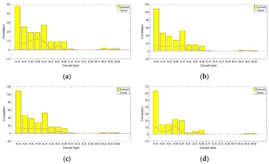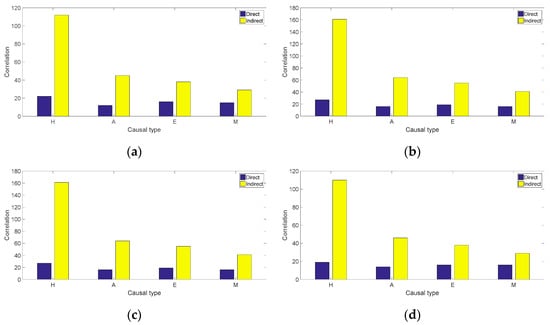 Figure 8 shows the statistical results of the direct and indirect correlations between the causal type and the different flight phases. It can be seen from the figure that the indirect correlation between each causal type and the flight phase is higher than the direct correlation in different phases. Specifically, the indirect correlation of the H-type causal factors is significantly higher than their direct correlation in all phases; the direct correlation of the H-type causal factors is higher than the direct correlation of the other causal factor types; the comparative results of the direct correlation of the causal factor types in different phases are H-type > E-type > M-type > A-type, with the indirect correlations being H-type > A-type > E-type > M-type; and the correlations of different causal factors in the take-off/landing and leveling phases are higher than those in the ground and maneuvering phases.