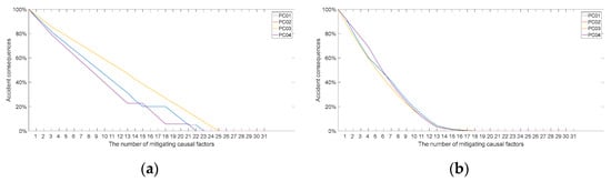Based on the correlation analysis between the direct and indirect severity of accident consequences caused by causal factors shown in Figure 9, it is possible to identify the causal factors that have a greater impact on the severity of accident consequences and their corresponding numerical values. By systematically controlling factors that have a significant influence during different flight phases, it is possible to effectively reduce the severity and impact of accident consequences, thereby enhancing the safety of the aircraft and onboard personnel. According to Equations (16) and (17), the causal factors are ranked in descending order based on their impact on the severity of accident consequences, and causative elimination is carried out. The resulting curves illustrating the impact of mitigating causal factors on the severity of accident consequences at different phases are shown in Figure 10.