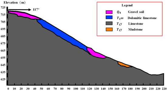 The Wujiang River Heshandu grand bridge of the Meishi highway construction project is located in Zunyi City, Guizhou Province, China (Figure 1a). The study area is a bank slope located on the side of the Meitan. The slope is an artificial slope formed by the excavation of the anchorage foundation pit of the bridge (Figure 1b,c). The occurrence of the slope is 117°∠45°. During construction, continuous tensile cracks were observed at the back edge of the slope top. These cracks had a width ranging from 5 cm to 20 cm and a visible depth of 0.4 m. Field monitoring showed displacements exceeding the standard norms, necessitating a reassessment of safety. Detailed geological investigations and drilling were conducted to identify the lithology. Highly to moderately weathered limestone is blocky, smooth, and undulating. The bedding and joint surfaces contain no infilling. Limestone layers are arranged in a monocline. The strata outcrops belong to the Yelang (T1y) formation of the Lower Triassic and Quaternary (Q4), as shown in Figure 2. The mean of the limestone layer dip direction is 98° with a 2° standard deviation. The mean of the limestone layer dip is 42° with a 3.4° standard deviation. The thickness of layer is 0.1–0.5 m (Figure 1d.). The core monitor rate is 80–85%; RQD = 60–85. Two joints were found on the site, J1 188°∠48° and J2 145°∠54°.
