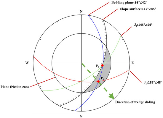 Kinematic analysis (Figure 4) was utilized to determine the potential sliding line and identify two intersections (P1 and P2) of joints and bedding. The friction angles of the joint and bedding plane are 22° and 27°. The average friction angle (24.5°) of the two slide planes (joint and bedding) is expressed as a plane friction cone in Figure 4. In general, sliding may occur if the intersection point between the two great circles of the sliding planes lies within the shaded area in Figure 4. In this study, the most likely direction of wedge sliding is the orientation represented by P1.