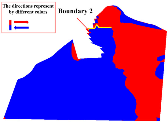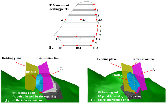 The point where the intersection line is exposed (Figure 5b,c) can be used to locate the two sliding surfaces. We identified 16 potential blocks based on these locating points (see Figure 5a). Figure 5b,c shows two examples of the potential blocks (Block 8 and Block 9). The safety of unstable blocks was assessed using the LEM, and the results (see Section 4.1) indicated two unstable blocks (Block 8 and Block 9). Each block was then modeled in the numerical simulations (Model 1 is for Block 8, and Model 2 is for Block 9).