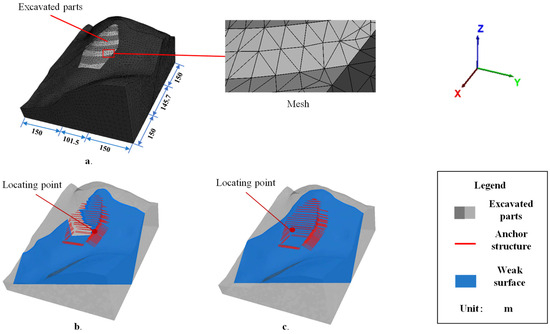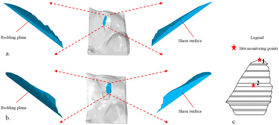 First, a pyramid-dominant mesh was generated with a specified min angle (15°) and min edge length (3 m). In this mesh, each boundary extended 150 m (Figure 6a), while the bottom extended 80 m. For the boundary conditions, horizontal motion (X and Y directions) is constrained at the four vertical boundaries, while both horizontal and vertical motions (X, Y and Z directions) are constrained at the bottom boundary. Then, the bedding planes forming two unstable blocks (Section 4.1) were inserted into the mesh and generated two models (Figure 6b is Model 1 for Block 8, and Figure 6c is Model 2 for Block 9). The mesh numbers of the two models are 33,312 (Model 1) and 34,877 (Model 2). Finally, we zoned excavated parts on the original terrain in each model (Figure 6a).
