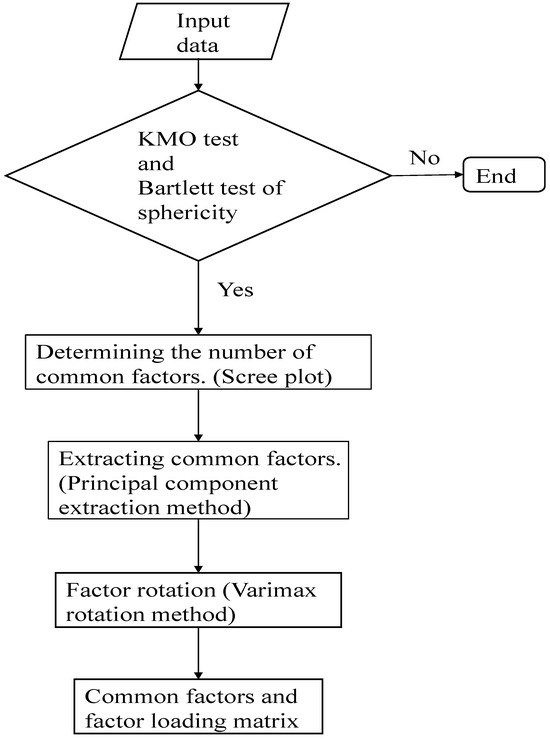 First, the FOS data for each model underwent the KMO test and Bartlett test of sphericity. Next, we quantified the common factors using a scree plot to identify the number of common factors by observing the elbow point [75,77]. We then used the principal component extraction method to obtain common factors [71]. To aid interpretation, we employed varimax rotation to regenerate the common factors [78]. Finally, we determined the triggering factors of each model by comparing the factor load values. The flow chart of the EFA is shown in Figure 7.