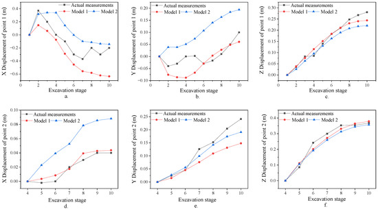 (a) X displacement of monitoring point 1. (b) Y displacement of monitoring point 1. (c) Z displacement of monitoring point 1. (d) X displacement of monitoring point 2. (e) Y displacement of monitoring point 2. (f) Z displacement of monitoring point 2.