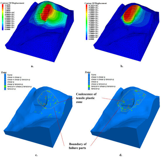 The newly formed shear bands occur in the slope. The tensile plastic zones of Model 1 appear on the free face of the slope (Figure 11c.). The lower sliding body’s traction may cut off the sliding body. The tensile plastic zones of Model 2 appear between the 5th and 8th steps and are near the free face (Figure 11d). The rock mass bulging may cause bending and cracks.
