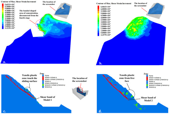 (a) Maximum shear strain increment cloud maps of sliding surfaces in Model 1, showing a banded shaped area (inset with the location of the screenshot). (b) Maximum shear strain increment cloud maps of sliding surfaces in Model 2 (inset with the location of the screenshot). (c) Tensile plastic zone of Model 1. The deepest area of the tensile plastic zone has touched the sliding surface. (d) Tensile plastic zone of Model 2.
