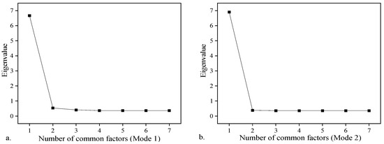 where Wi is the ith given factor, F1–Fn are n common factors, a1–an are factor loadings (correlation coefficient between a common factor and a variable), and Ui is the unique variation of Wi. The contribution rate of variation described by a common factor represents the significance of this common factor. The factor loading measures the significance of a variable when using this variable to characterize a specific factor [70]. Most importantly, it allows one to determine how well the variable aligns with common factors and allows the identification of the most important variable according to the factor loading [75]. The commonality of a variable is the percentage of variations of this variable explained by all common factors. A commonality of a variable closer to 1 indicates a better explanation [70]. It should be noted that before the EFA analysis, the Kaiser–Meyer–Olkin (KMO) and Bartlett test of sphericity need to be implemented on the raw data to verify its feasibility [76].