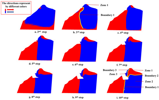 - The sliding surface of Model 1 is exposed on the slope surface (Figure 10a). The unexcavated part on the right is significantly deformed, which means the sliding block is pulling the unexcavated part of the rock mass. The coalescence of the plastic tensile zone appears on the 3rd, 5th, 7th and 8th steps (Figure 10c).