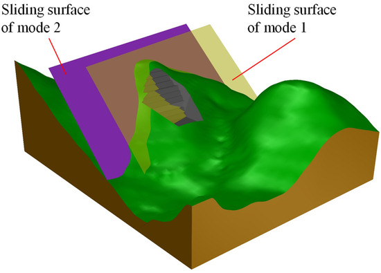 In recent years, many researchers have reported that different failure modes may occur in a slope [13,14,15]. They have studied the influence of weak interlayers (such as joints, bedding, foliation, and other discontinuities) on slope failure modes using numerical simulations and physical experiments [16,17,18,19,20]. On the other hand, experiment studies of structural plane materials [21,22,23] have explored the slope failure mechanism from a microscopic point of view. Additionally, some novel numerical methods for modeling the structure plane were proposed to assist in analysis [24,25]. However, few articles have mentioned the effects of weak interlayers at different locations. Experiments or simulations based on a single weak interlayer may not be able to characterize the failure mechanism comprehensively. It is necessary to investigate slope failure modes based on multiple potential sliding surfaces. Additionally, in forward analysis, the numerical method may make it difficult to identify all the potential sliding surfaces since the failure has not yet occurred. The traditional limit equilibrium method (LEM) performs well in this regard due to its clear concept and convenience.