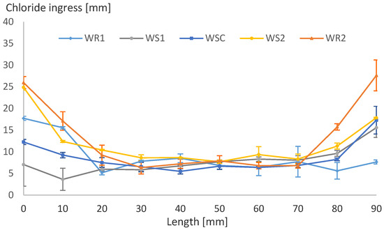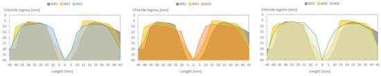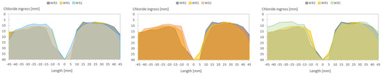 3.2.3. Cracked Specimens Constantly Submerged and Subjected to wet/dry Cycles in a NaCl Solution