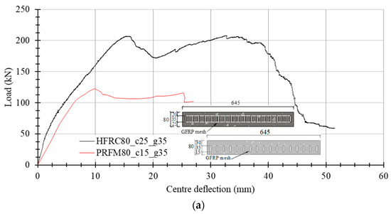Force vs. centre deflection of (a) PFRM80_c15_g35 vs. HFRC80_c25_g35 and (b) PFRM100_c15_g35 vs. HFRC100_c30_g35.