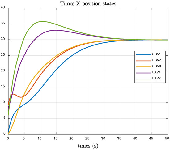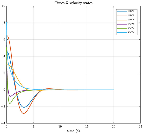 Utilizing the algorithms presented in Equations (31) and (33) and comparing them with those from Reference [29], simulations of the UAV and UGV systems are depicted in Figure 1, Figure 2, Figure 3, Figure 4, Figure 5, Figure 6, Figure 7, Figure 8, Figure 9, Figure 10, Figure 11 and Figure 12. The comparison demonstrates that both protocols facilitate consensus among UAVs and UGVs.