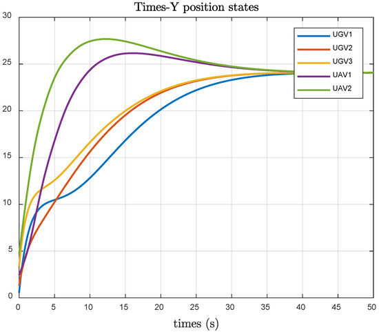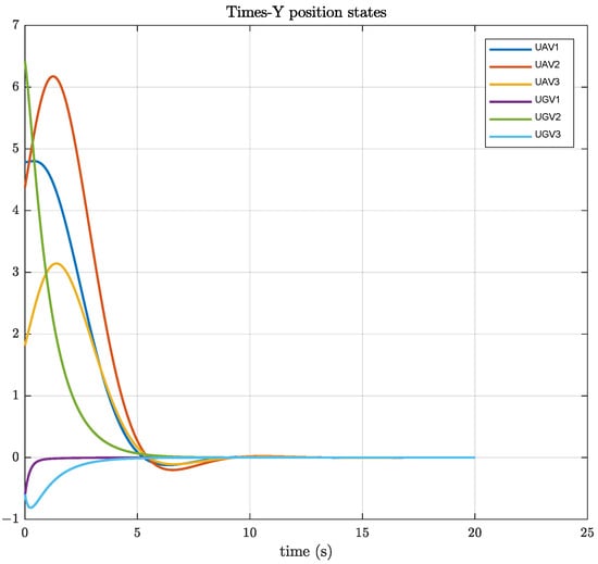 Figure 3 shows that under the optimal fault-tolerant consistency protocol, the UAV and UGV systems stabilize regarding position consistency error in the Y-direction between . Figure 4 demonstrates that using the consistency protocol proposed in Reference [29], the UAV and UGV systems stabilize regarding the position in the Y-direction .
