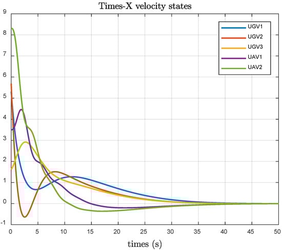 Figure 6 illustrates that the UAV and UGV systems achieve stable velocity consistency errors in the X-direction under the optimal fault-tolerant consistency algorithm. Figure 7 demonstrates that using the consistency control algorithm from reference [29], the UAV and UGV systems achieve stable velocity states in the X-direction between .