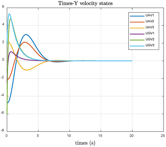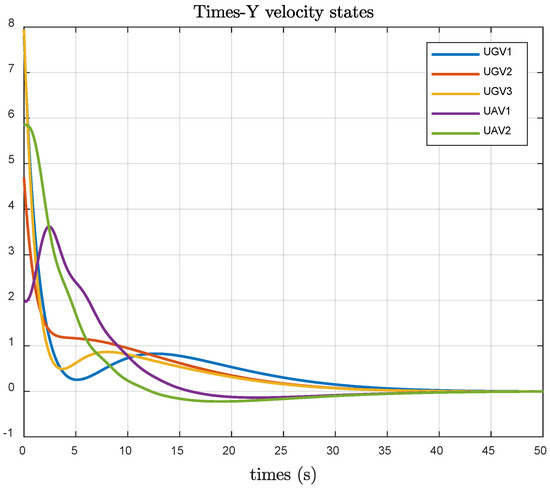 Figure 8 illustrates that the UAV and UGV systems achieve stable velocity consistency errors in the Y-direction under the optimal fault-tolerant consistency algorithm. Figure 9 shows that using the consistency control algorithm from reference [29], the UAV and UGV systems achieve stable velocity states in the Y-direction .
