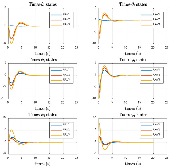 Figure 11 and Figure 12 show that Figure 11 depicts the stabilization of the roll angle, yaw angle, pitch angle, and their corresponding angular velocities of the UAV system under the optimal fault-tolerant consistency protocol . Figure 12 illustrates the stabilization of the roll angle, yaw angle, and their corresponding angular velocities of the UAV under the algorithm proposed in Reference [29] . It also demonstrates the optimal fault-tolerant consistency algorithm’s superiority, considering actuator faults. This algorithm enables heterogeneous multi-agent systems to achieve quicker consistency in the presence of faults, reducing the time required to complete tasks.