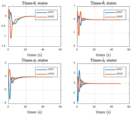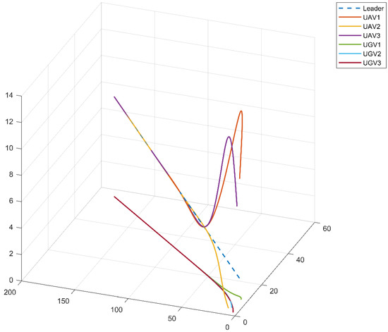 We plot the state trajectory of all UAVs and UGVs in this leader–following heterogeneous multi-agent system, as shown in Figure 13. The experimental outcomes show that the states of all following UAVs and UGVs converge to the leader’s position and velocity. This further demonstrates the efficiency and feasibility of the algorithm (31) and (33).