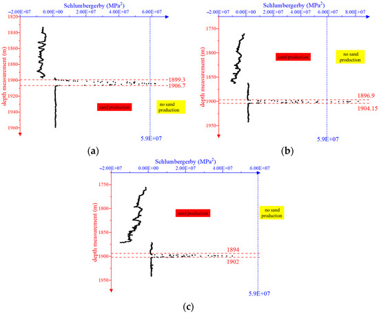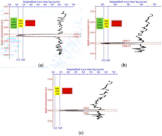Sand simulation results of acoustic time difference method on wells W05A (a), W10 (b) and W19 (c).