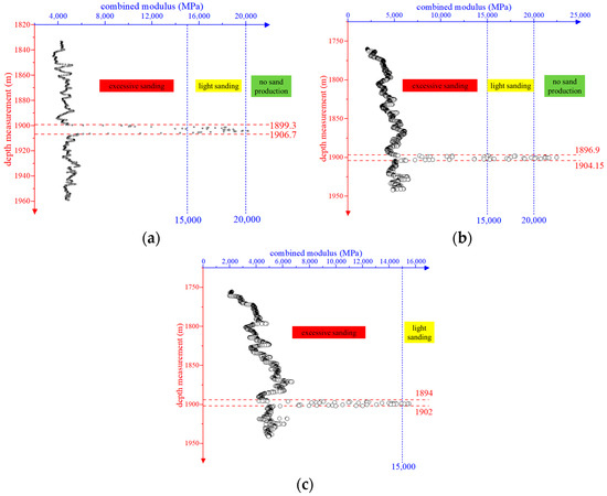 Sand simulation results of combined modulus method for wells W05A (a), W10 (b) and W19 (c).