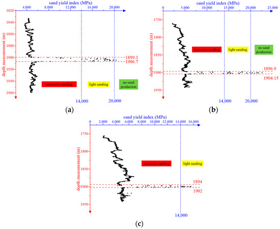 Simulated sand output results of sand output index for wells W05A (a), W10 (b) and W19 (c).