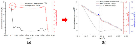 Temperature and pressure change curves of single-group experiments and partial enlargement. (a) Pressure-temperature variation in a single set of experiments. (b) Pressure drop followed by a slow decrease.