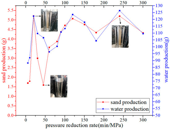 It can be seen from Figure 23 that, under different buckling rates, water production and sand production show a good correlation. In general, when the water production is large, the sand production is also large, indicating that the water production is the main controlling factor leading to the sand production in the process of hydrate extraction, and the effect of sand carrying is not to be neglected when the gas production reaches a certain scale. With the gradual slowing down of the rate of pressure reduction, the overall trend of water production and sand production first increases then decreases, then increases and gradually stabilises. It is shown that there are optimal buckling intervals under different buckling schemes, which are related to the mechanisms of stratigraphic deterioration.