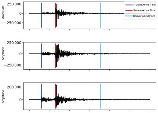 We preprocess the filtered sample data, cut the waveform according to the first arrival sampling point of the P-wave and the S-wave provided by the data label, randomly cut the 3 to 5 s before the arrival of the P-wave as the waveform starting point and select the 10 s after the arrival of the S-wave as the waveform ending point, and cut the waveform data to a length of 30 s. When the length after cutting is less than 30 s, zero values are randomly used before or after the data for supplement. After cutting, all the data are normalized to prevent the model from overfitting and affecting the training effect of the model. The normalization operation is shown in Equation (2), where represents the amplitude value of the seismic waveform data.
